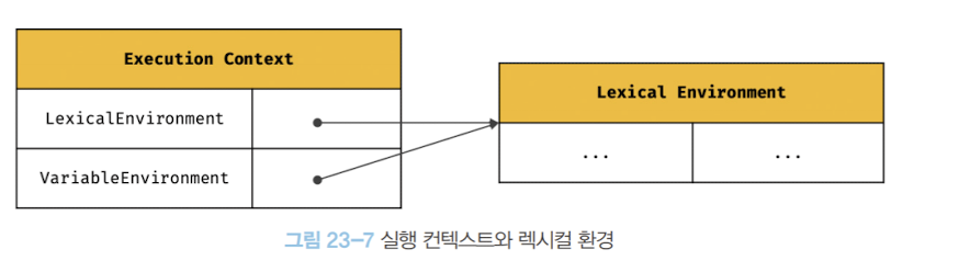이때 함수 렉시컬 환경의 구성 요소인 외부 렉시컬 환경에 대한 참조에는 함수 객체의 내부 슬롯 [[Environment]]에 저장된 렉시컬 환경의 참조가 할당된다. 이것이 바로 함수 정의 위치에 따라 상위 스코프를 결정하는 렉시컬 스코프의 실체다.