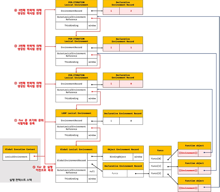 for 문의 변수 선언에서 let 키워드로 선언한 변수를 사용하면 for 문의 코드 블록이 반복 실행될 때마다 for 문 코드 블록의 새로운 렉시컬 환경이 생성된다. 만약 for 문의 코드 블록 내에서 정의한 함수가 있다면 이 함수의 상위 스코프는 for 문의 코드 블록이 실행될 때마다 생성된 for문 코드 블록의 새로운 렉시컬 환경이다.