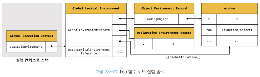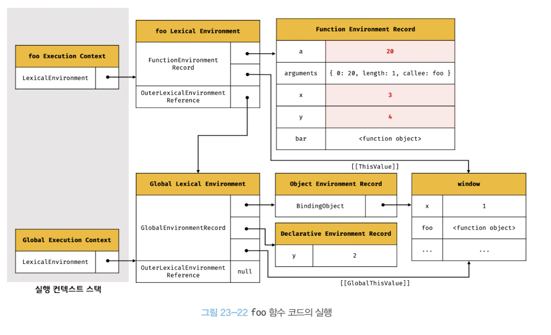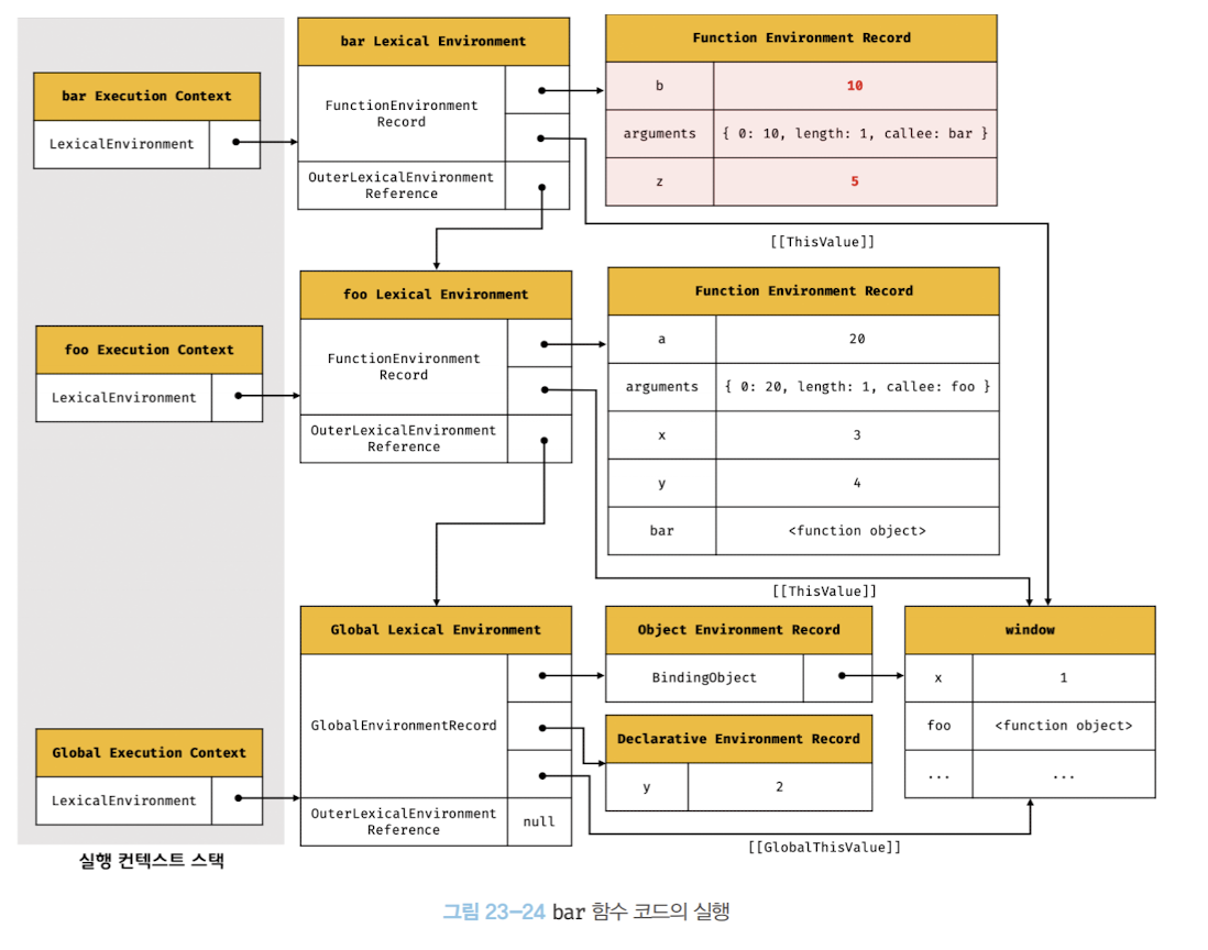 함수의 상위 스코프는 함수를 어디서 정의했느냐에 따라 결정되므로 foo 함수와 bar 함수의 상위 스코프는 전역이다. 즉, 함수의 상위 스코프는 함수를 정의한 위치에 의해 정적으로 결정되고 변하지 않는다. 스코프의 실체는 실행 컨텍스트의 렉시컬 환경이다. 이 렉시컬 환경은 자신의 "외부 렉시컬 환경에 대한 참조"를 통해 상위 렉시컬 환경과 연결된다. 렉시컬 환경의 "외부 렉시컬 환경에 대한 참조"에 저장할 참조값, 즉 상위 스코프에 대한 참조는 함수 정의가 평가되는 시점에 함수가 정의된 위치에 의해 결정된다. 이것이 바로 렉시컬 스코프다.