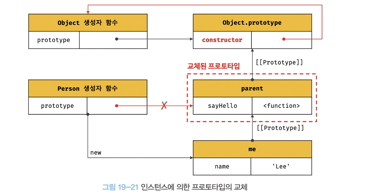 이는 Person.prototype.sayHi 메서드가 단 한번 생성되는 클로저이기 때문이다. 이 메서드는 즉시 실행 함수가 호출될 때 생성된다. 이때 자신의 상위 스코프인 즉시 실행 함수의 실행 컨텍스트의 렉시컬 환경의 참조를 [[Environment]]에 저장하여 기억한다. 따라서 Person 생성자 함수의 모든 인스턴스가 상속을 통해 호출할 수 있는 Person.prototype.sayH 메서드의 상위 스코프는 어떤 인스턴스로 호출하더라도 하나의 동일한 상위 스코프를 사용하게 된다.